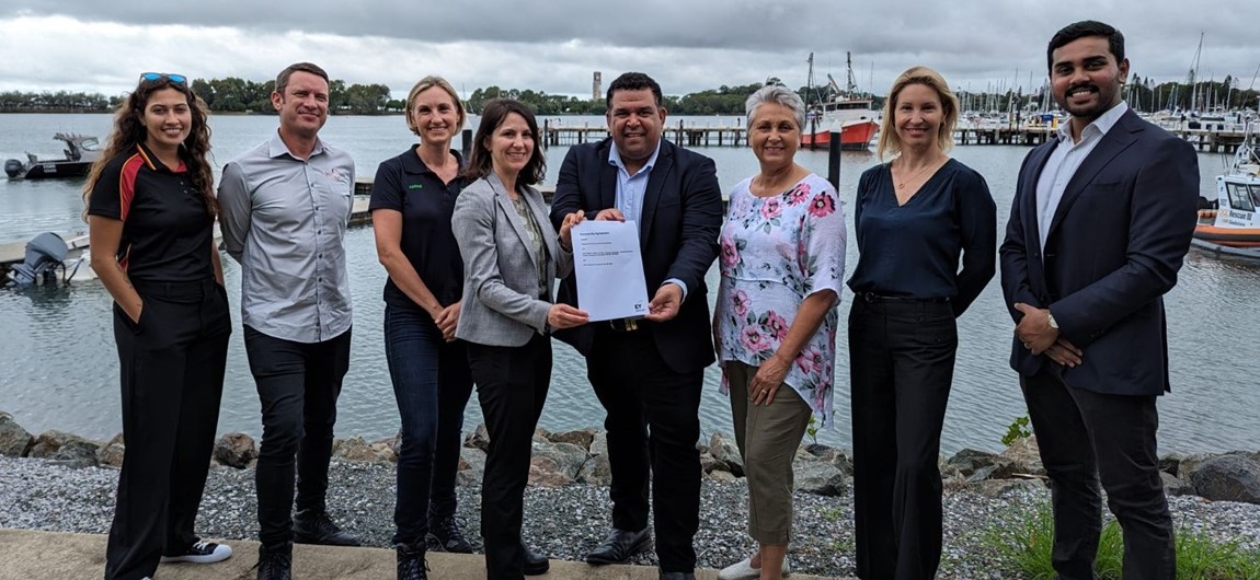 Pictured at Gladstone Marina: L-R: Shyla Appo PCCC Trust, Nick Maclean PCCC Trust, Kerrie Jocumsen Fortescue, Catriona McLeod European Energy, Matthew Cooke PBC, Marcia McCullough PBC, Eva Hanly Fortescue, Gene Sams European Energy.