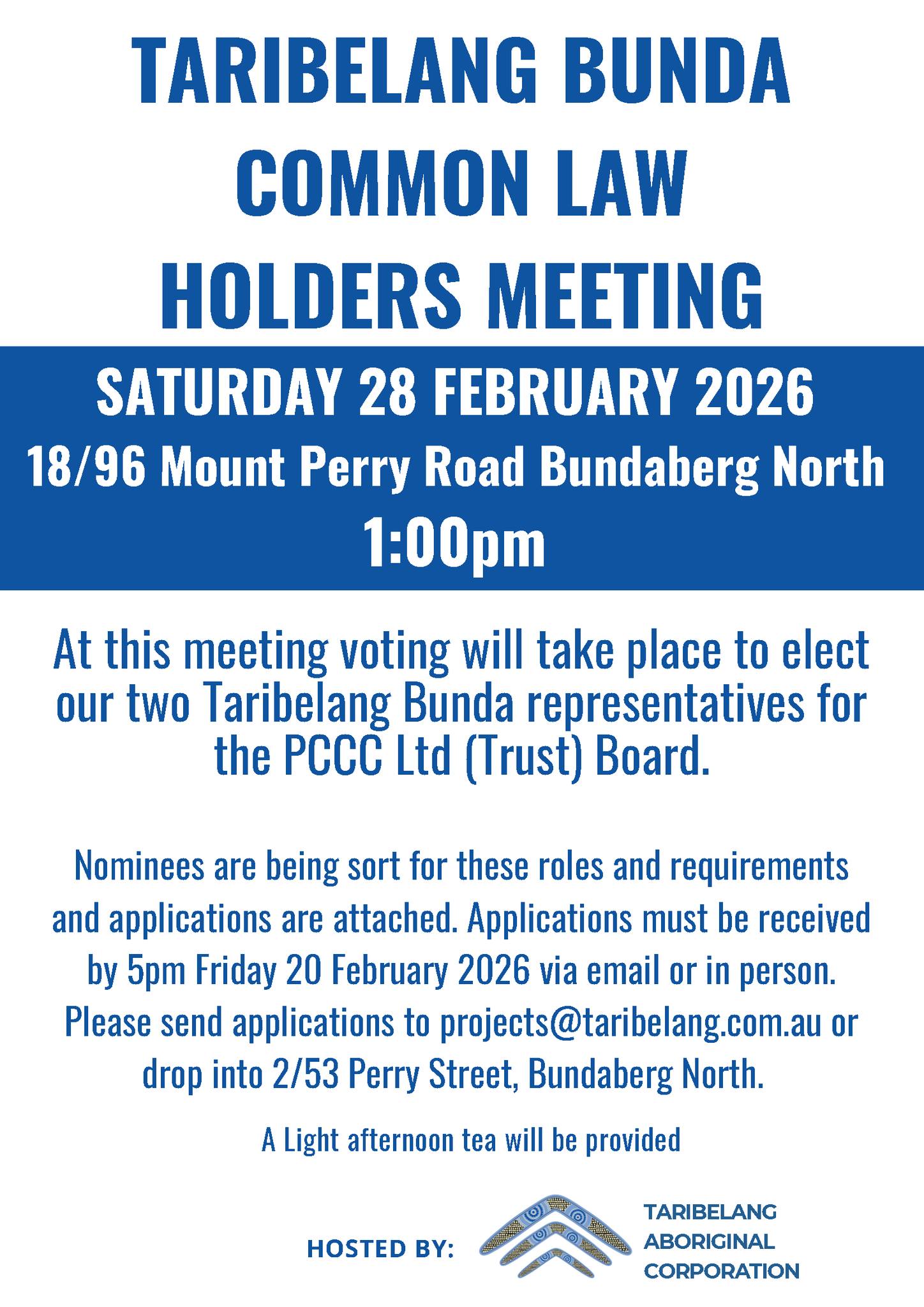 This meeting is hosted by the Taribelang Aboriginal Corporation. A light afternoon tea will be provided.