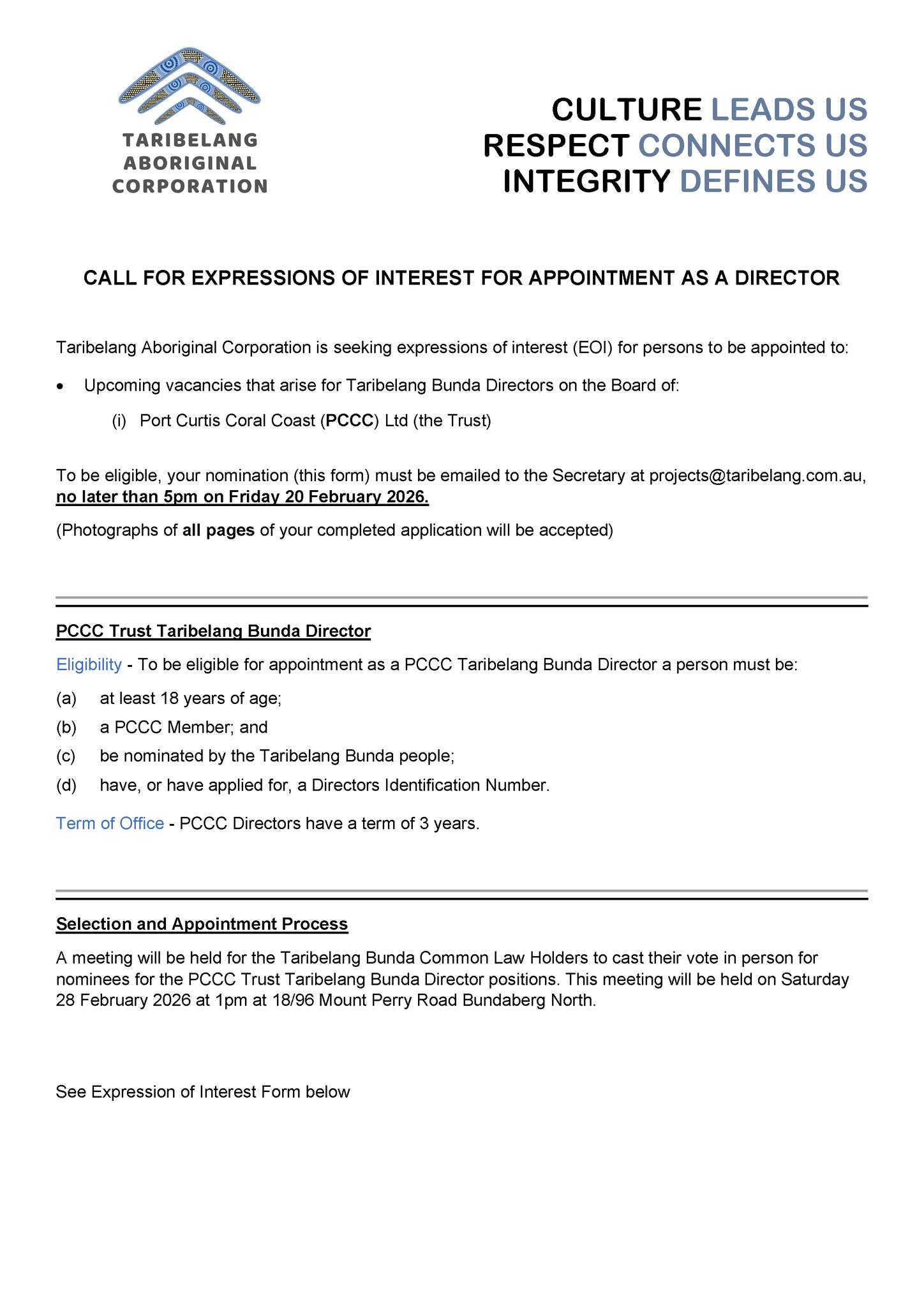 The Taribelang Bunda Common Law Holders are invited to attend a meeting to elect two (2) Taribelang Bunda representatives to the Port Curtis Coral Coast Ltd (PCCC Ltd) Board.