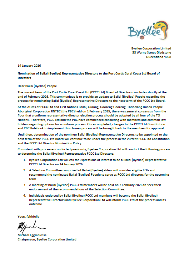 Expressions of interest (EOI) are sought for Bailai (Byellee) persons to be appointed to upcoming vacancies on the Board of Port Curtis Coral Coast Ltd
